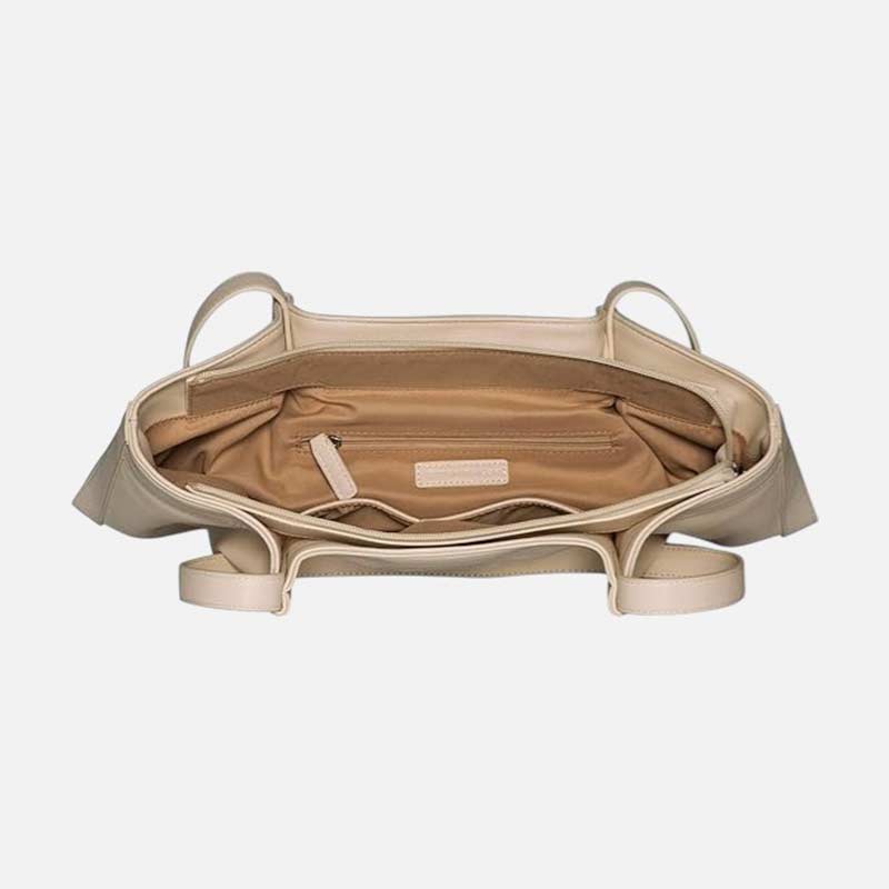 Su silueta tipo tote en formato apaisado combina líneas clásicas con detalles actuales, como las bandas decorativas en el frontal, que elevan el look sin recargarlo. El resultado: un bolso de hombro para mujer versátil, fácil de integrar en estilismos urbanos y minimalistas.