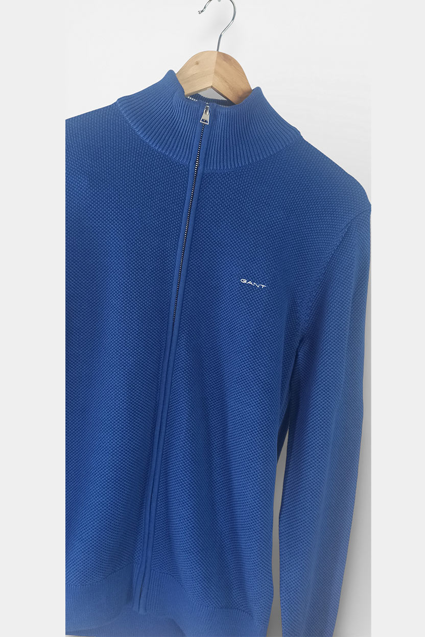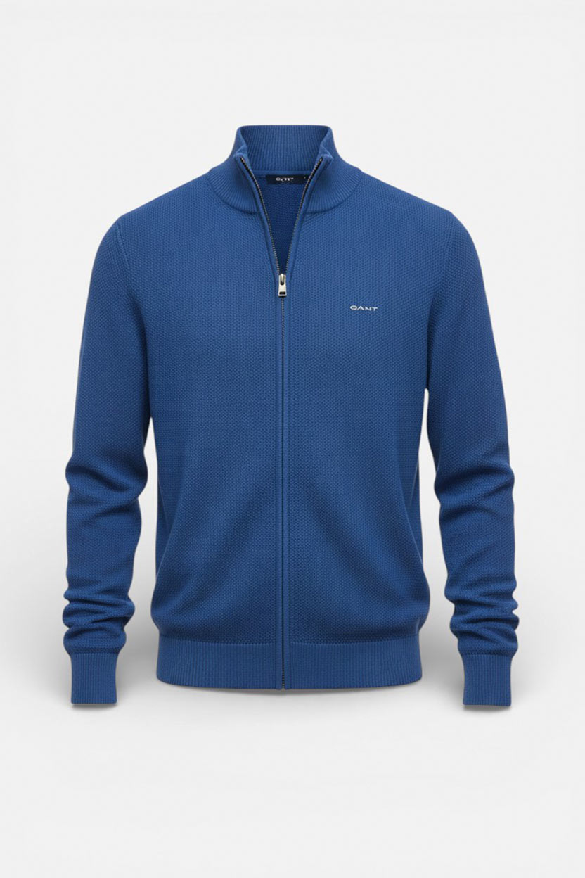 Modelo localizado como GANT Cotton Piqué Zip Cardigan: un cárdigan de punto con cremallera completa, cuello alto tipo funnel y una textura piqué (micro-relieve) que le da un acabado más premium que un punto liso. El logo GANT bordado en el pecho remata el look con discreción y elegancia.