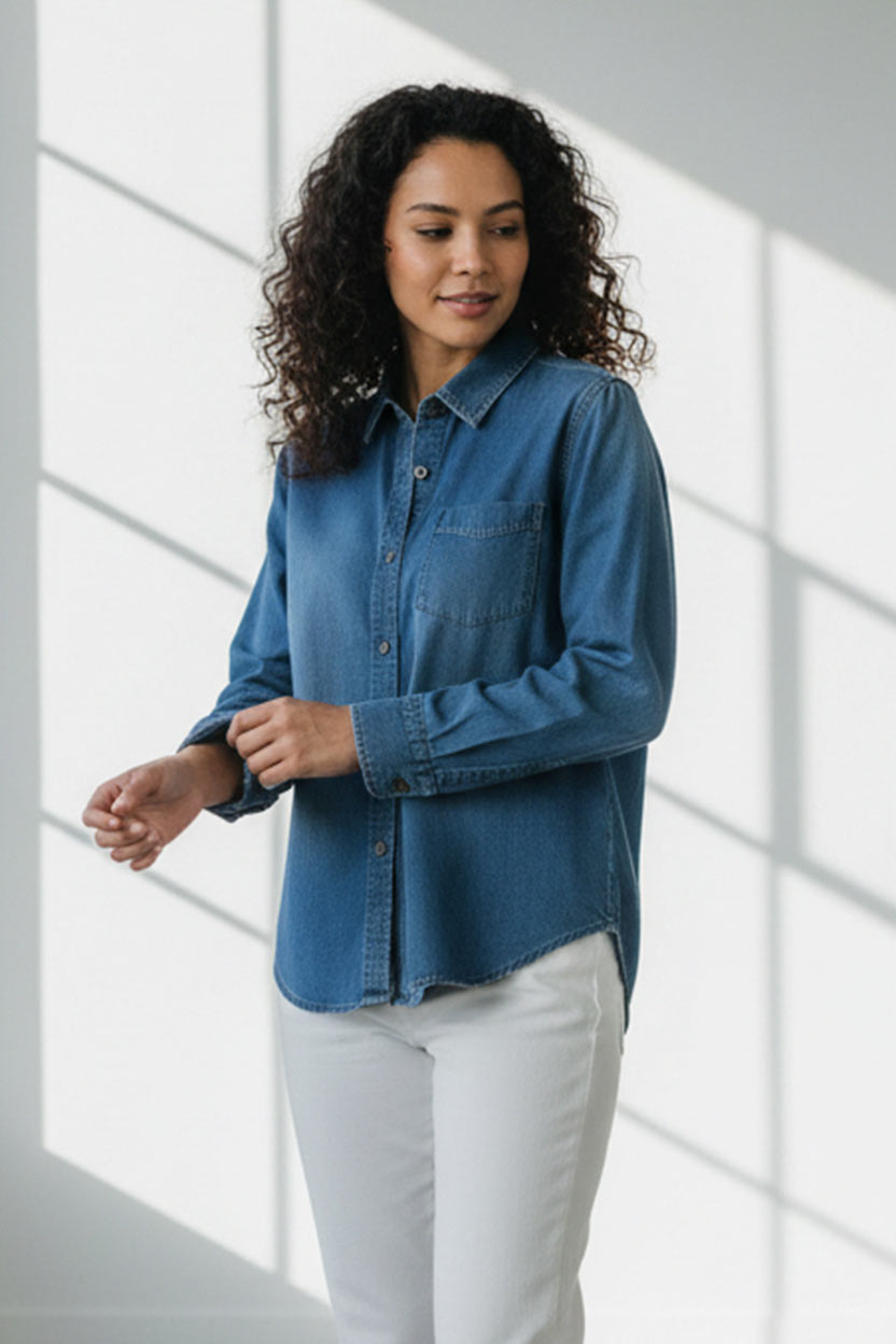 Su tejido de mezclilla suave 100% algodón se siente agradable al tacto y acompaña el cuerpo con un ajuste fitted (entallado) que estiliza sin perder comodidad. Úsala como camisa cerrada o abierta tipo sobrecamisa ligera: te resuelve looks en segundos y funciona todo el año. Mavi