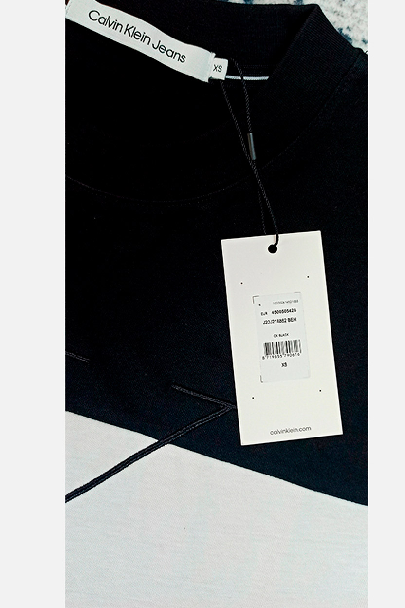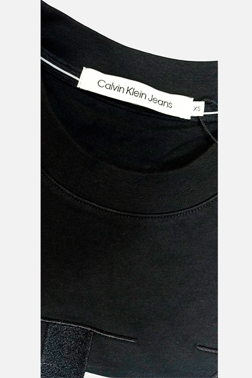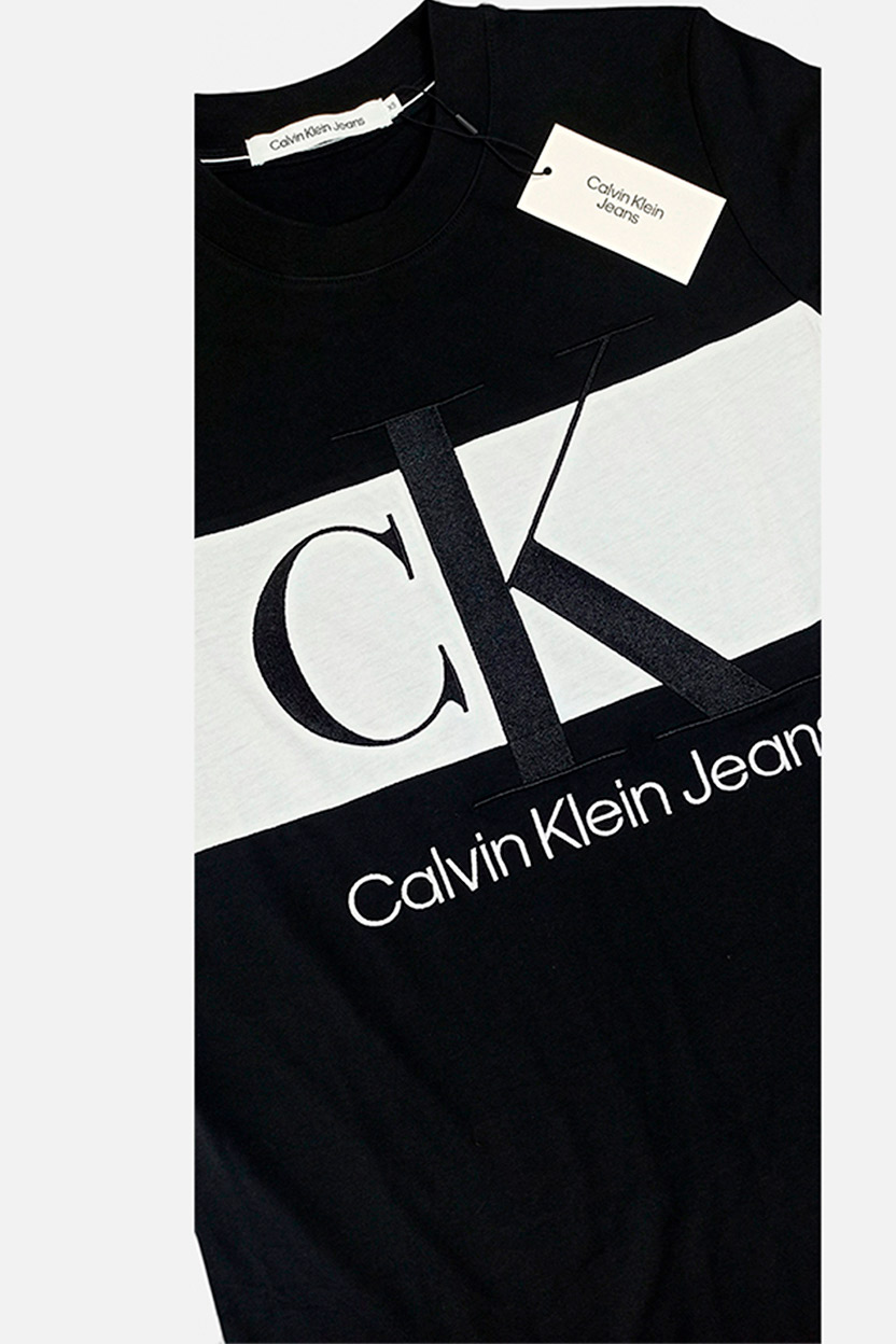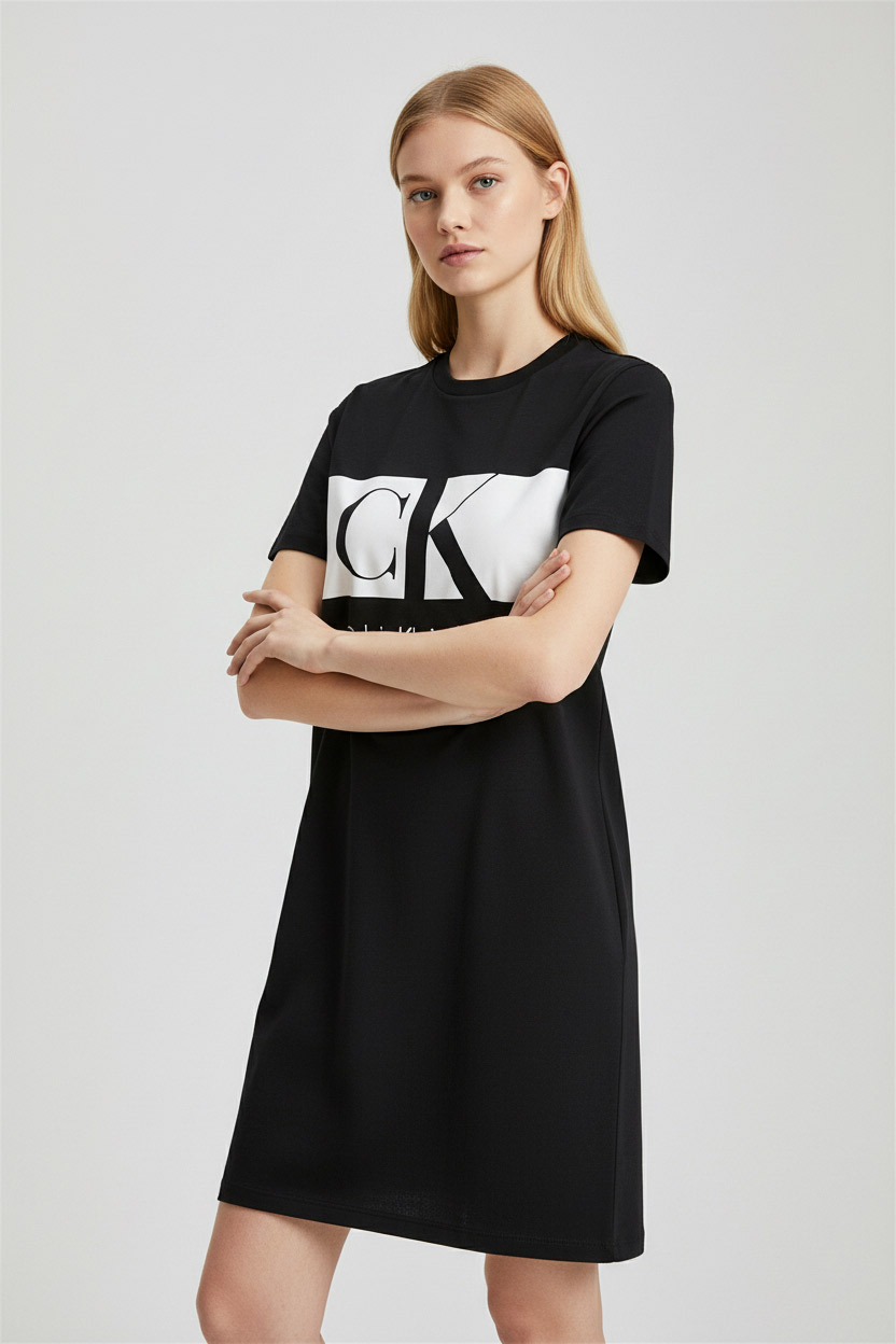 Vestido camiseta Calvin Klein Blocking T-Shirt Dress de mujer, en color negro, con diseño tipo t-shirt dress muy cómodo y urbano. Corte recto por encima de la rodilla, cuello redondo y manga corta, con logo Calvin Klein en contraste en el pecho con efecto color block, ideal para looks casuales con deportivas o sandalias.